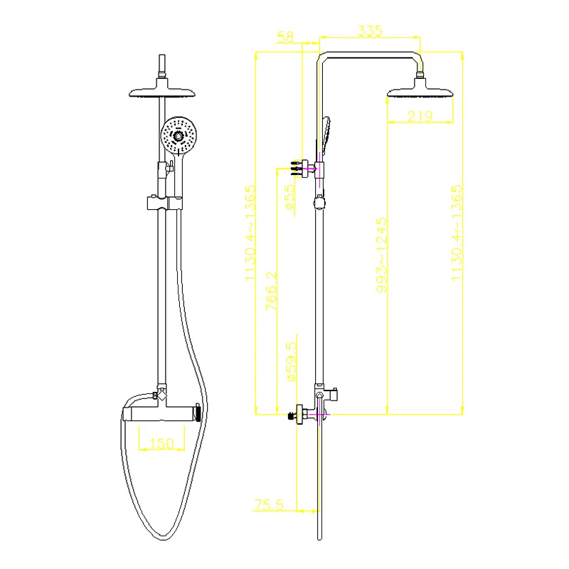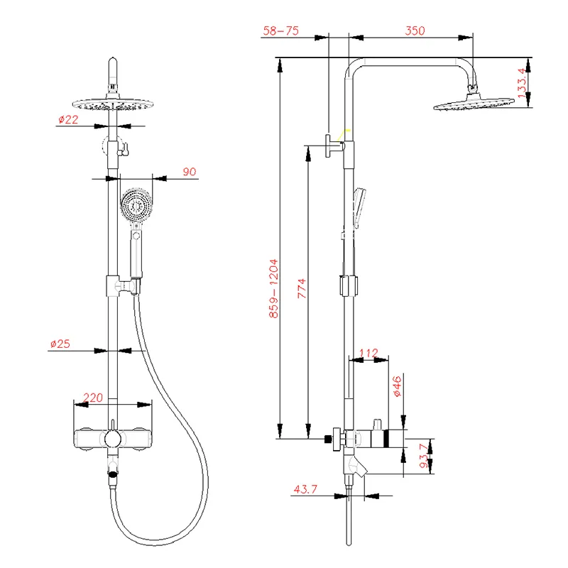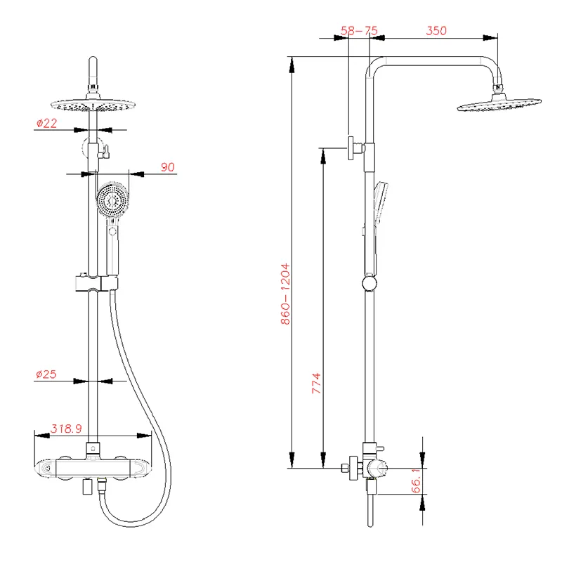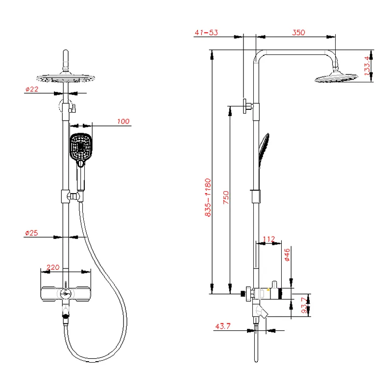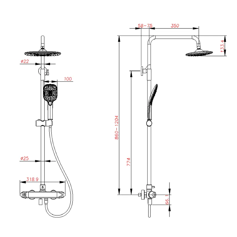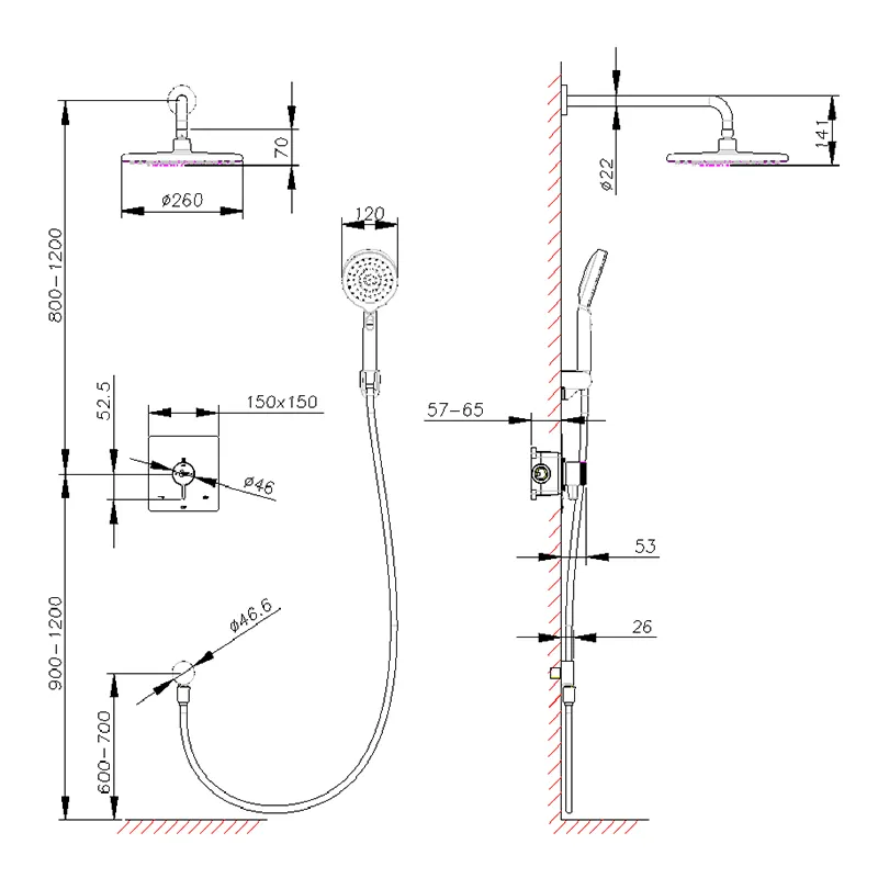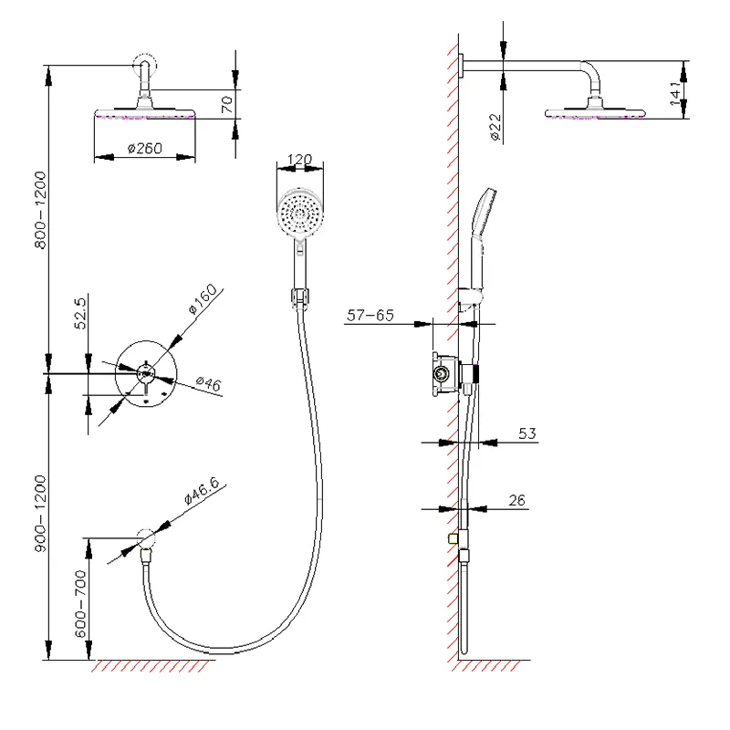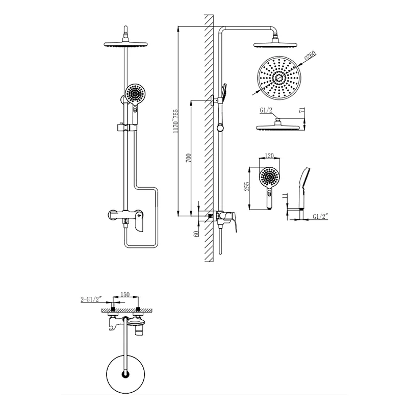 - Configuration: rainfall shower head + 3-function handheld shower head with spray gun