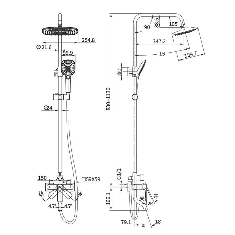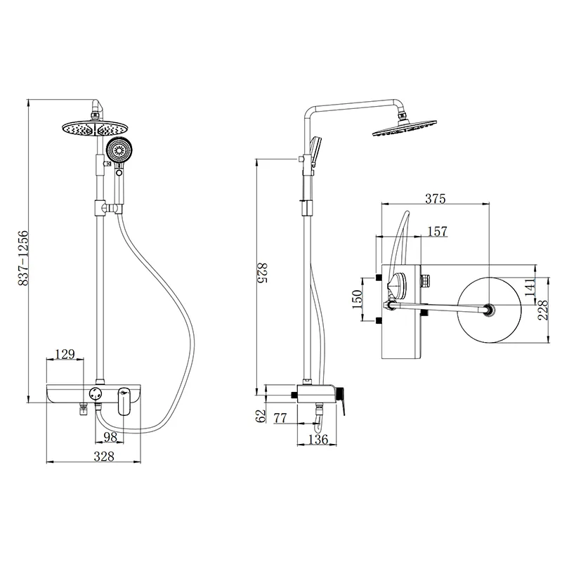 - Three functions shower fixtures: overhead rainfall shower, handheld spray, faucet