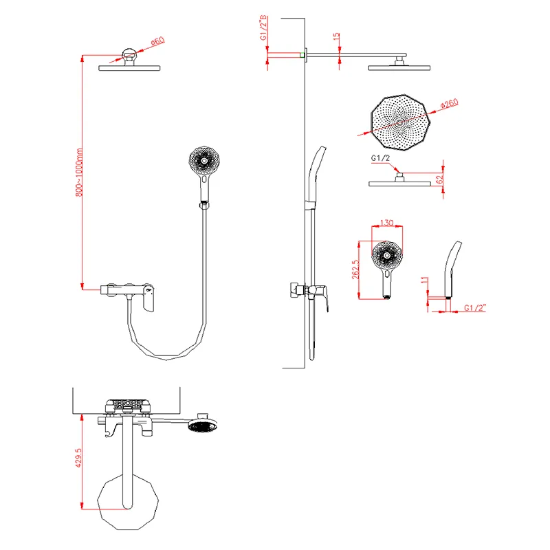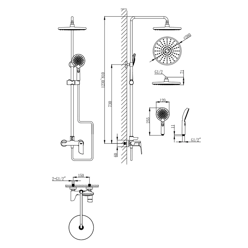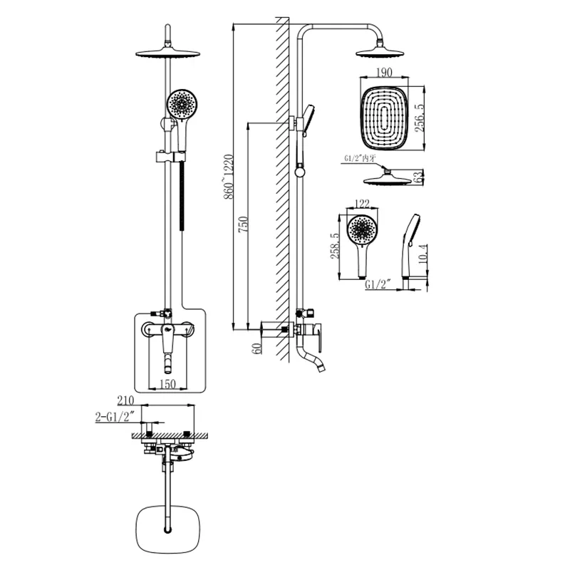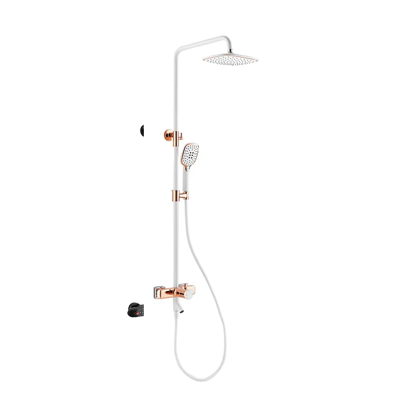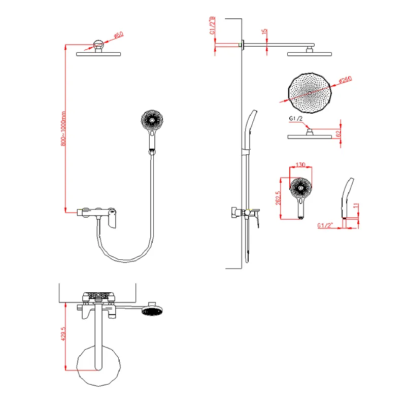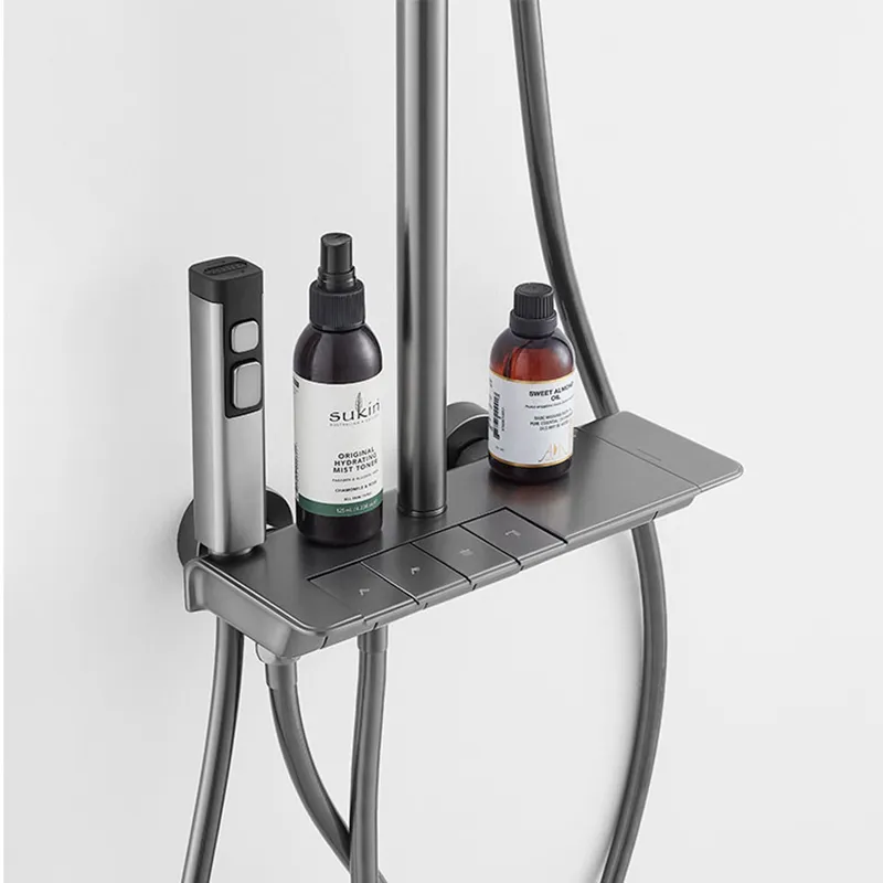 - Configuration: 3-outlet knob + large glass storage rack + 254mm round rainfall shower head + pressure-assisted handheld shower head (suitable for low water pressure areas)
