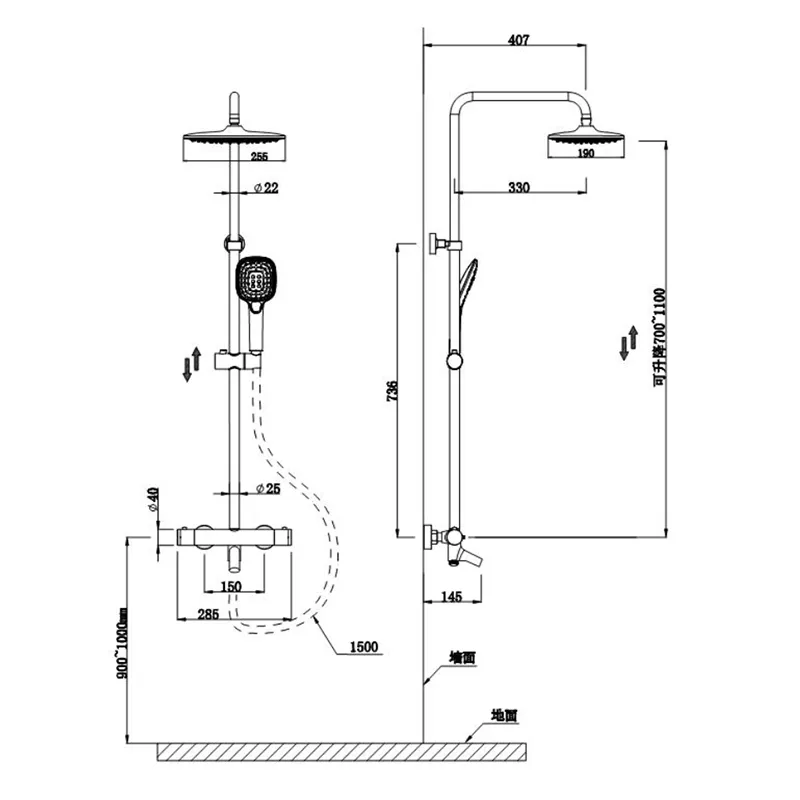 - Configuration: 11 inch square (or 10 inch round) rainfall shower head + 3 mode handheld shower head