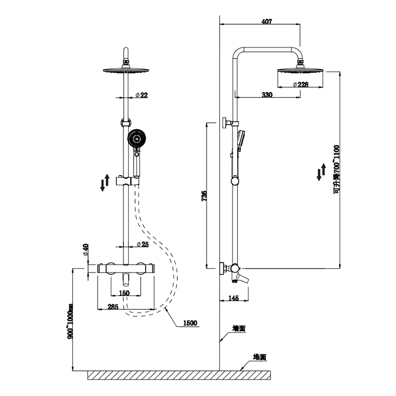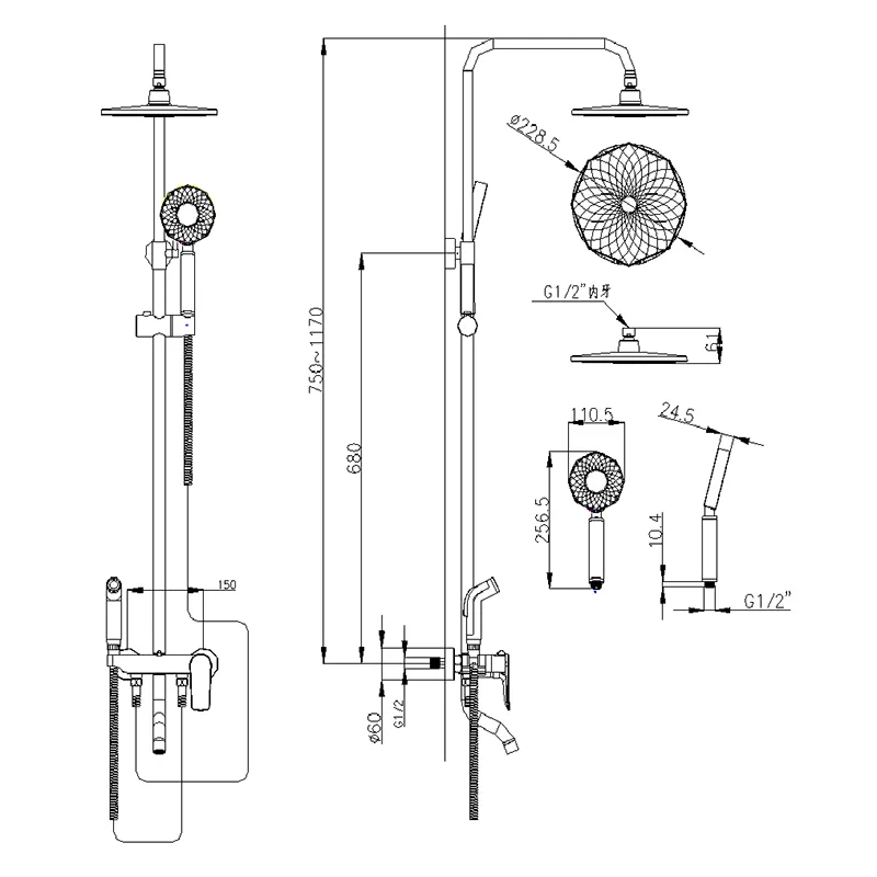 - Configuration: 9 inch round rainfall shower head + 3 mode height-adjustable handheld shower head