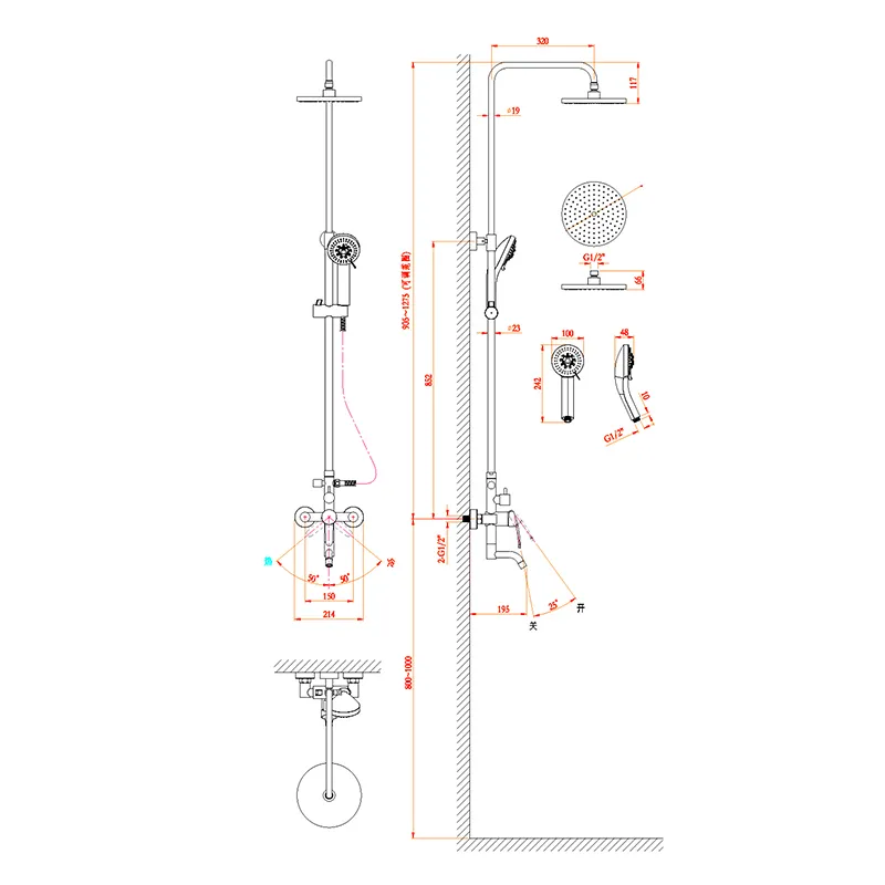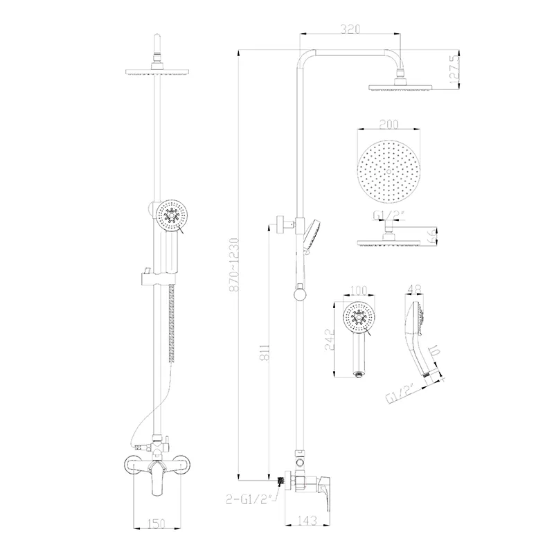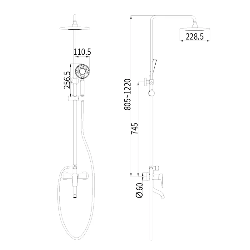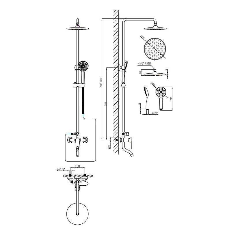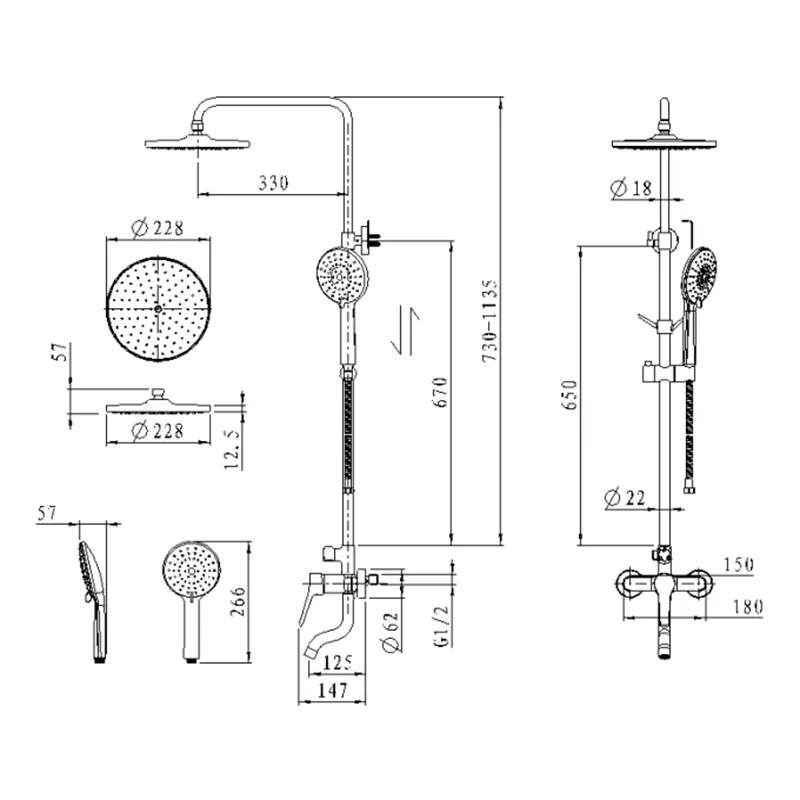 - Configuration: 223mm round ABS rainfall shower head + 3-function 108mm handheld shower head
